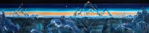 Der breite, panoramaartige Bildraum verstärkt diesen Eindruck von Ferne und Offenheit. Gebirgsartige Formationen, fließende Farbzonen und leuchtende Übergänge zwischen Dunkelblau, Türkis und hellen Akzenten erzeugen eine Landschaft zwischen Tag und Nacht, Nähe und Distanz, Realität und Imagination. Die Farbe Blau wirkt dabei nicht statisch, sondern atmosphärisch: Sie trägt den Blick durch das Bild und macht die Landschaft als wandelbaren Raum erfahrbar. So wird „Wanderlust“ zu einem Bild über Bewegung, Orientierung und die Sehnsucht nach einem offenen Horizont.