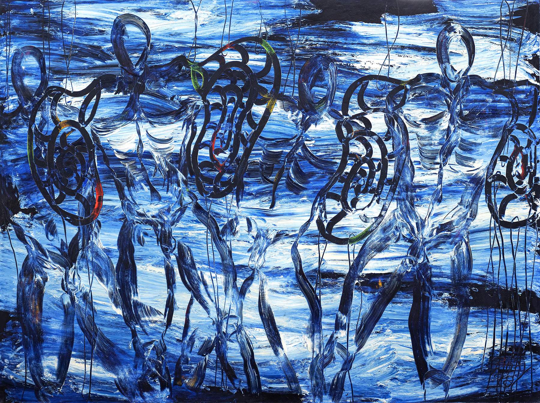 Die schwarzen, spiralförmigen Linien wirken wie eine zweite, kalligrafische Ebene. Sie verweisen auf Schneckenhäuser, Wirbel und innere Bewegungsmuster und geben dem Werk eine rhythmische Struktur. So entsteht ein spannungsreicher Bildraum zwischen Schutz und Verletzlichkeit, Langsamkeit und Dynamik, Figuration und Auflösung. Blau wird hier zum Träger einer expressiven, fast körperhaften Energie.